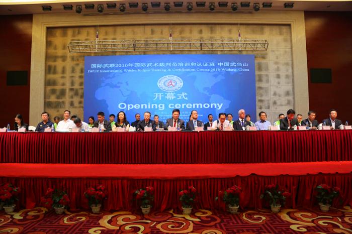 国际武术联合会执行副主席吴廷贵,中国武术协会主席、国家体育总局武术运动管理中心主任张秋平,中国武术协会副主席、国际武联技委会主任陈国荣,湖北省体育局党组成员、武汉体育学院党委书记彭道海,中国武术协会副主席张玉萍,国际武联技委会副主任皮特沃,原武汉体育学院党委书记、武当山国际武术学院名誉理事长黄浩军,武汉体育学院副院长漆昌柱,十堰市人民政府副市长刘学勤,武当山旅游经济特区工委书记、管委会主任吴先锋,中国武术协会特邀副主席、武当山国际武术学院理事长王茂国,国家体育总局武术运动管理中心训练竞赛一部主任金肖冰,国家体育总局武术运动管理中心推广培训部主任章王楠,武当山国际武术学院党总支书记、院长马世坤等出席开班典礼,典礼由陈国荣主持。