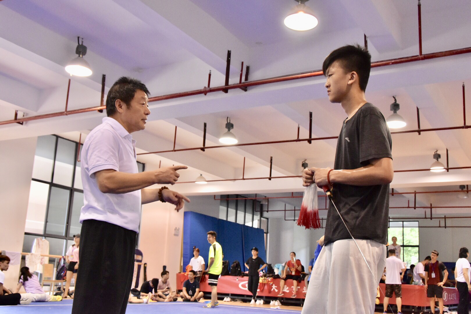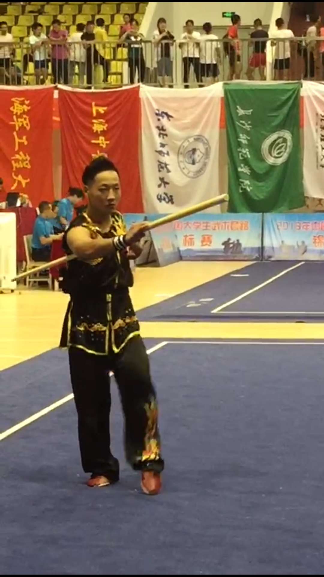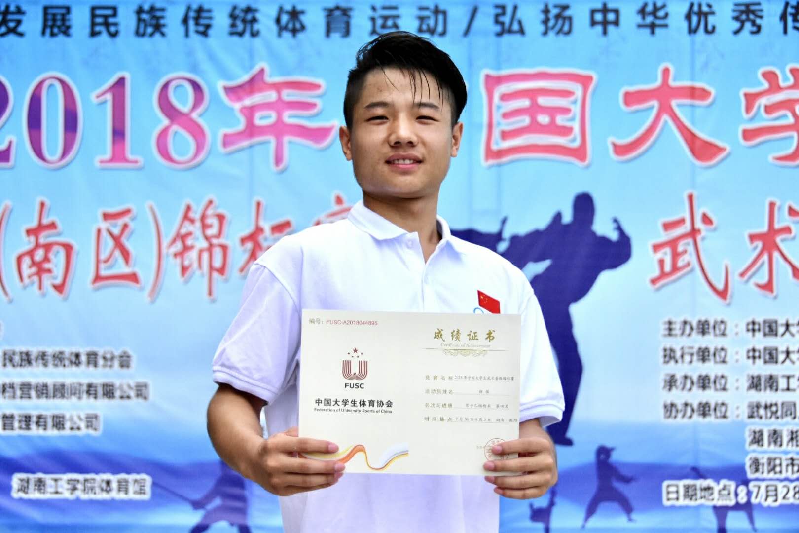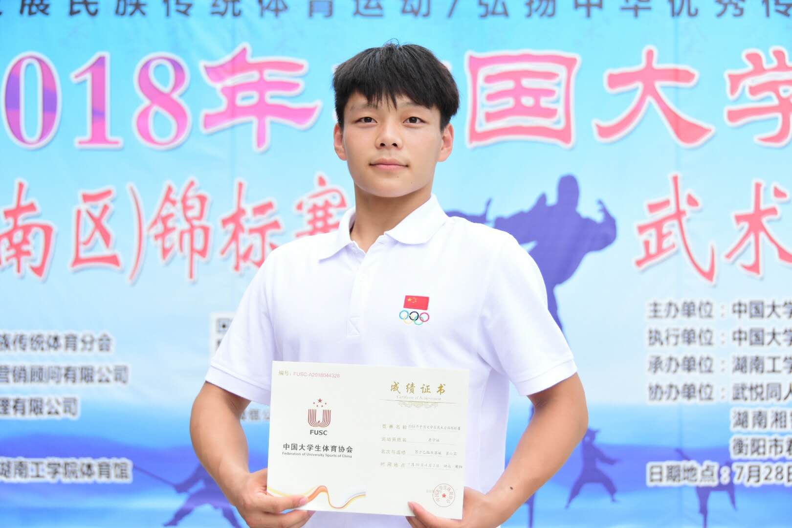 2018年中国大学生武术套路锦标赛进行到第二日,我院代表队在副院长杨群力教授和教练们的精心指导下,继续发扬顽强拼搏的精神,7月31号再次取得良好成绩:宋伟雄棍术第四名、郑强枪术第四名、孙崇锟南棍第五名、唐守福九节鞭第六名、唐守福八极拳第七名。