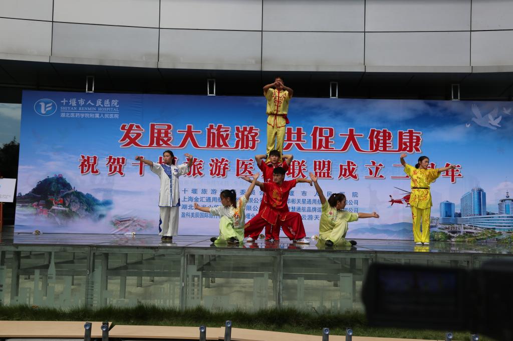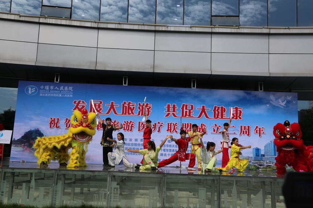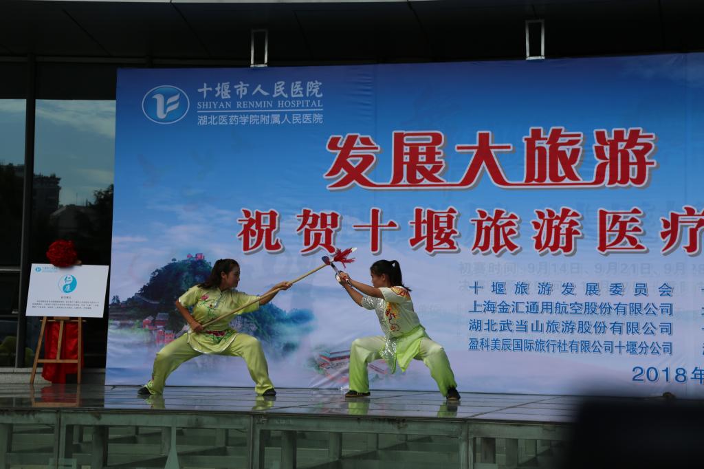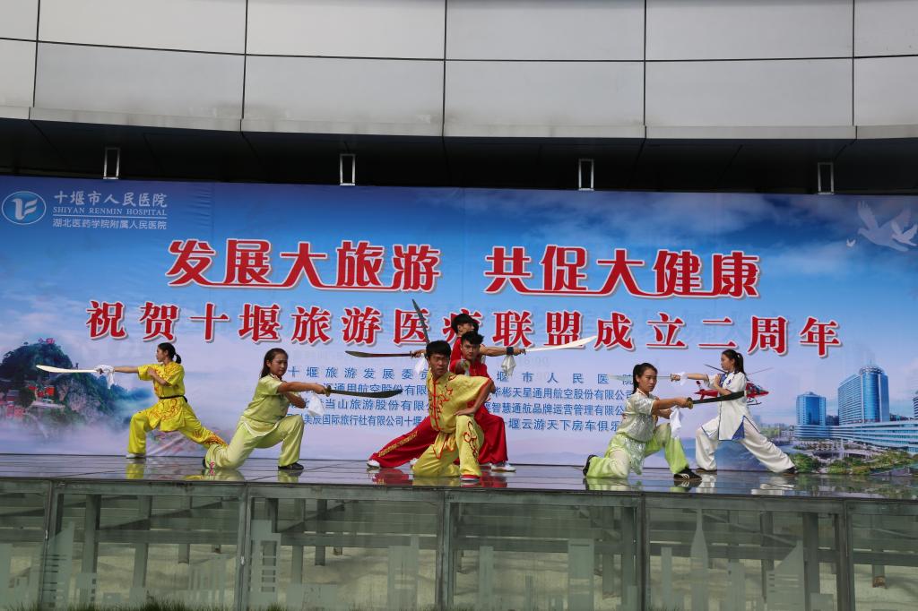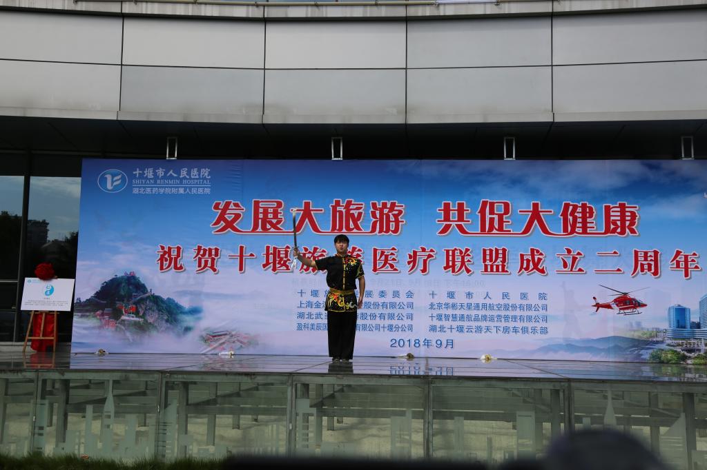 2018年9月30日,为庆祝十堰旅游医疗联盟成立两周年,我院武术代表队在武术教研室张亚东、李荣熙老师的带领下赴十堰市人民医院参加系列庆祝演出活动。