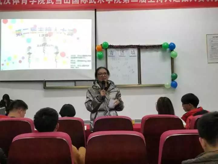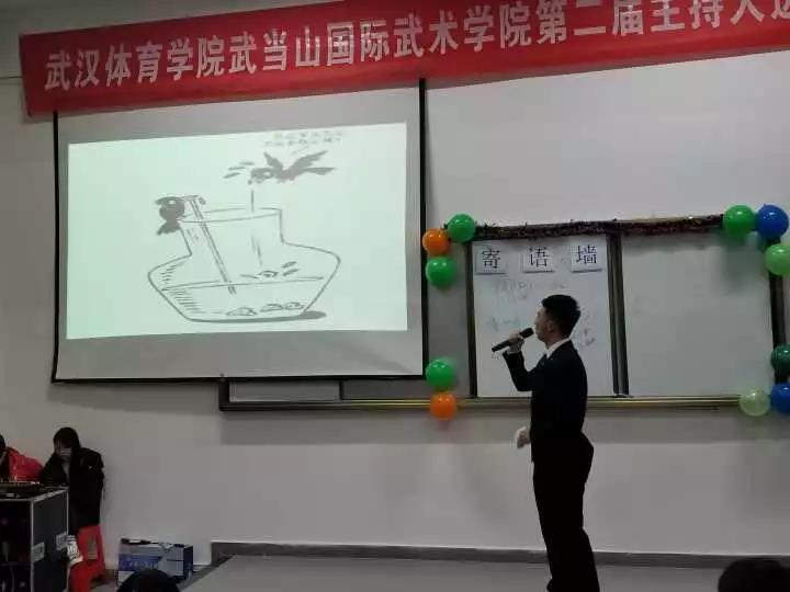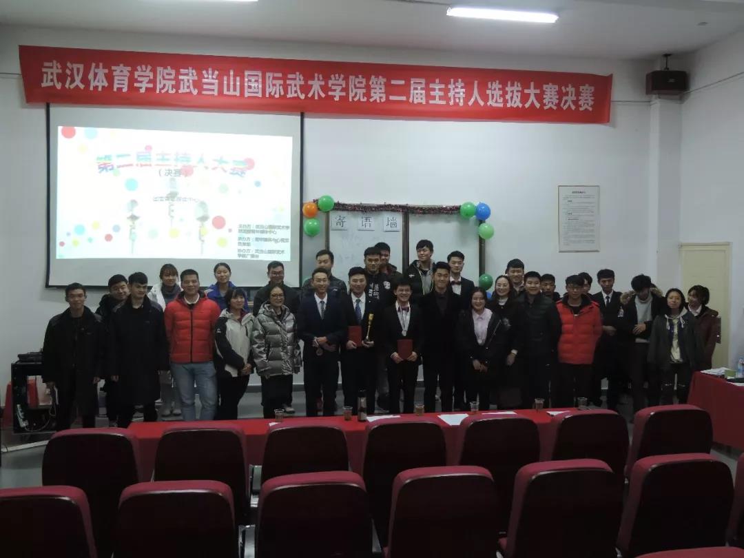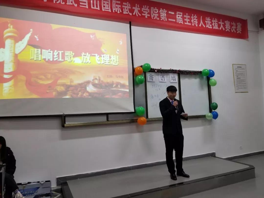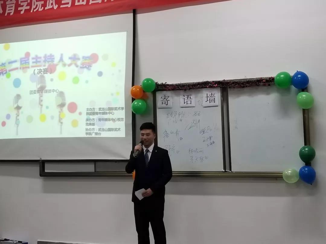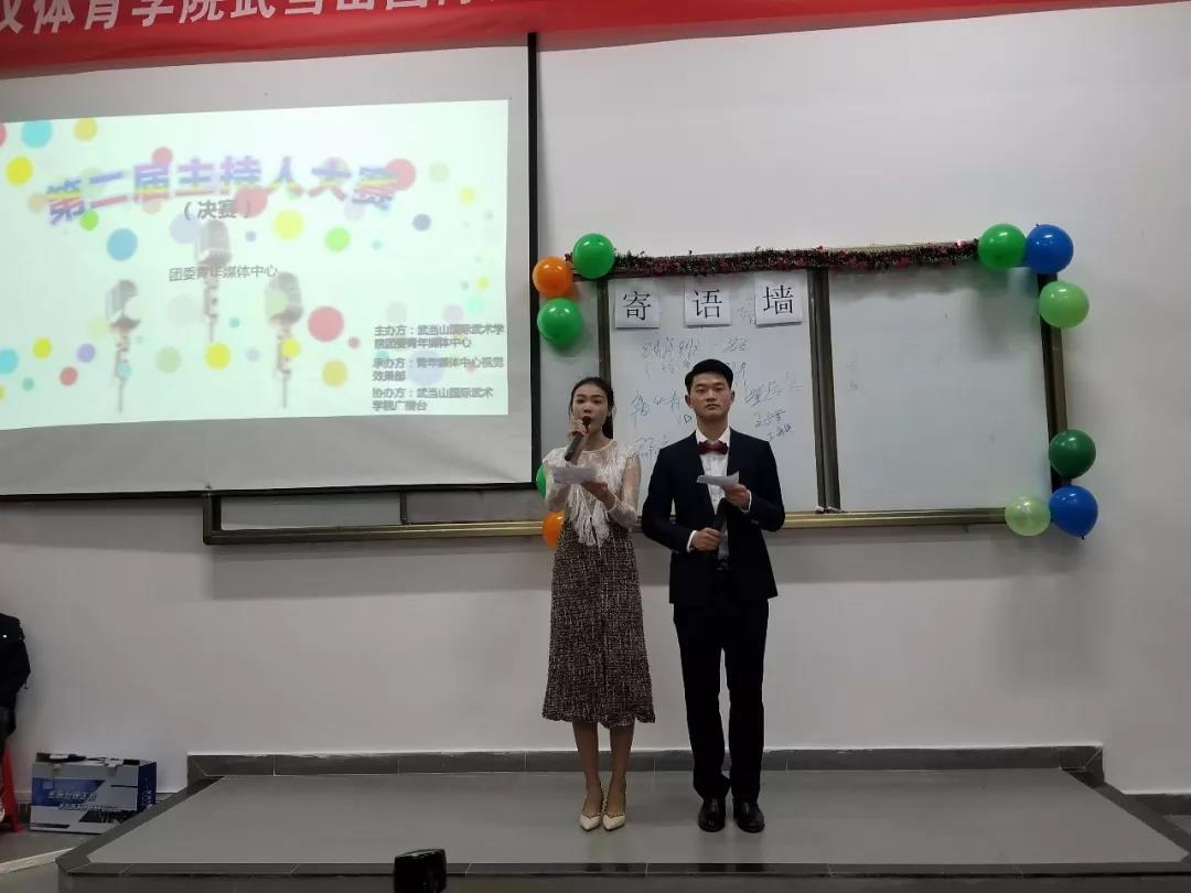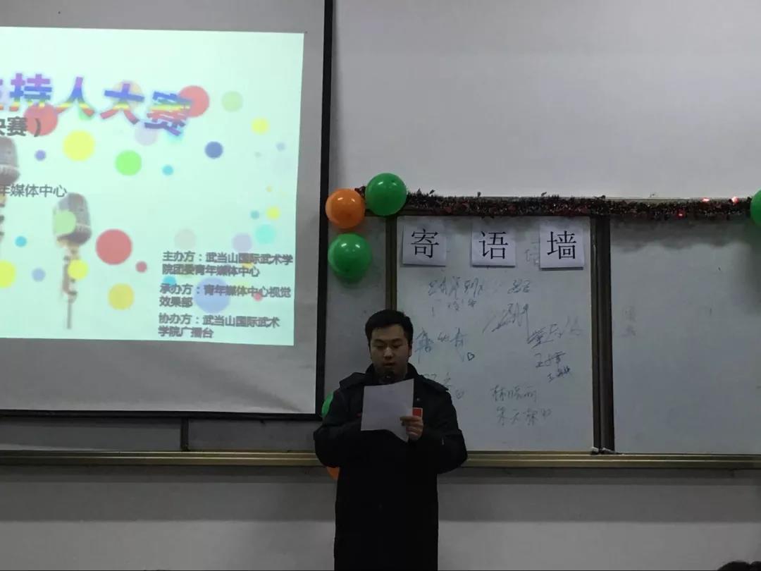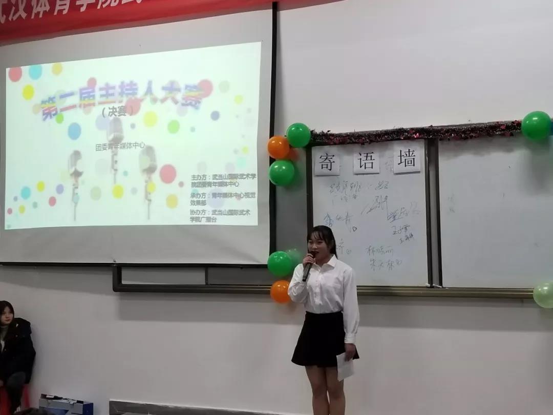 经过初赛的层层选拔,武汉体育学院武当山国际武术学院团委青年媒体中心联合院广播台于2018年12月7日晚上7:00在阶梯教室102举行第二届主持人大赛决赛。参加本次活动的评委及嘉宾有武汉体育学院武当山国际武术学院学科教研室主任王博老师,实习老师谭大强、熊双杰、徐娇、王成、袁草欣。本次大会由李玲和王海峰担任主持人。