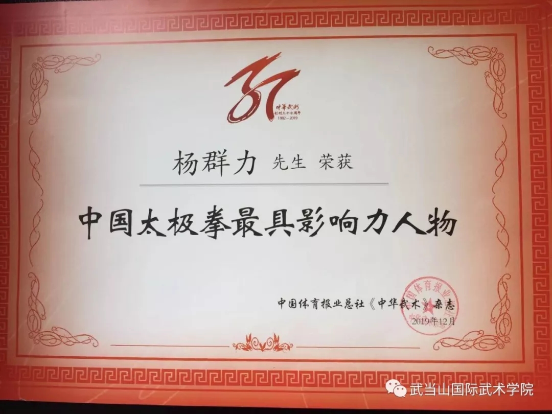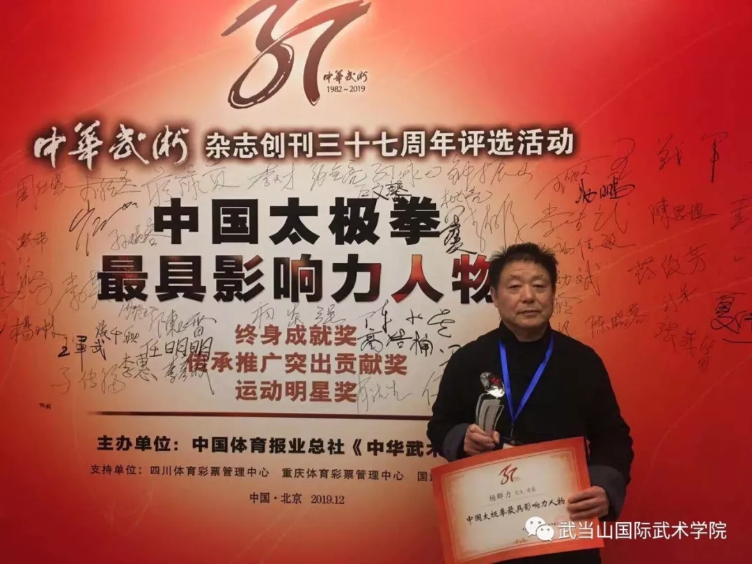 2019年12月28日,中国体育报业总社《中华武术》杂志创刊37周年颁奖典礼在京隆重举行,37位“中国太极拳最具影响力人物”揭晓。我院副院长杨群力教授荣获“中国太极拳最具影响力人物”称号。