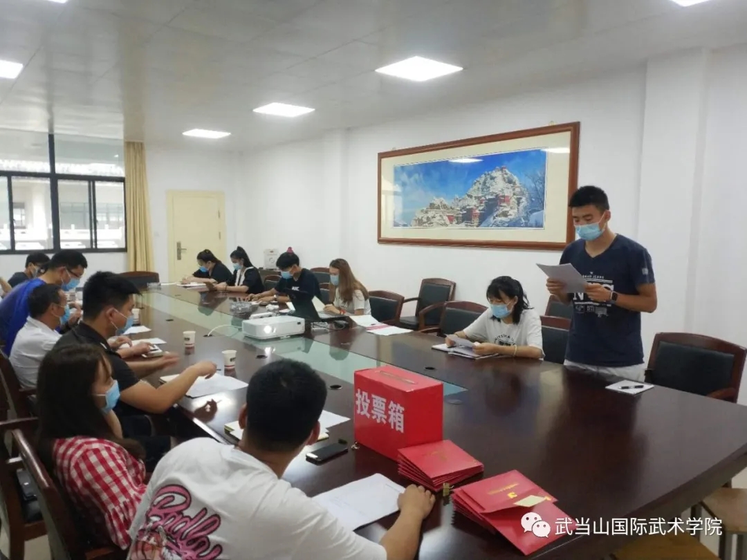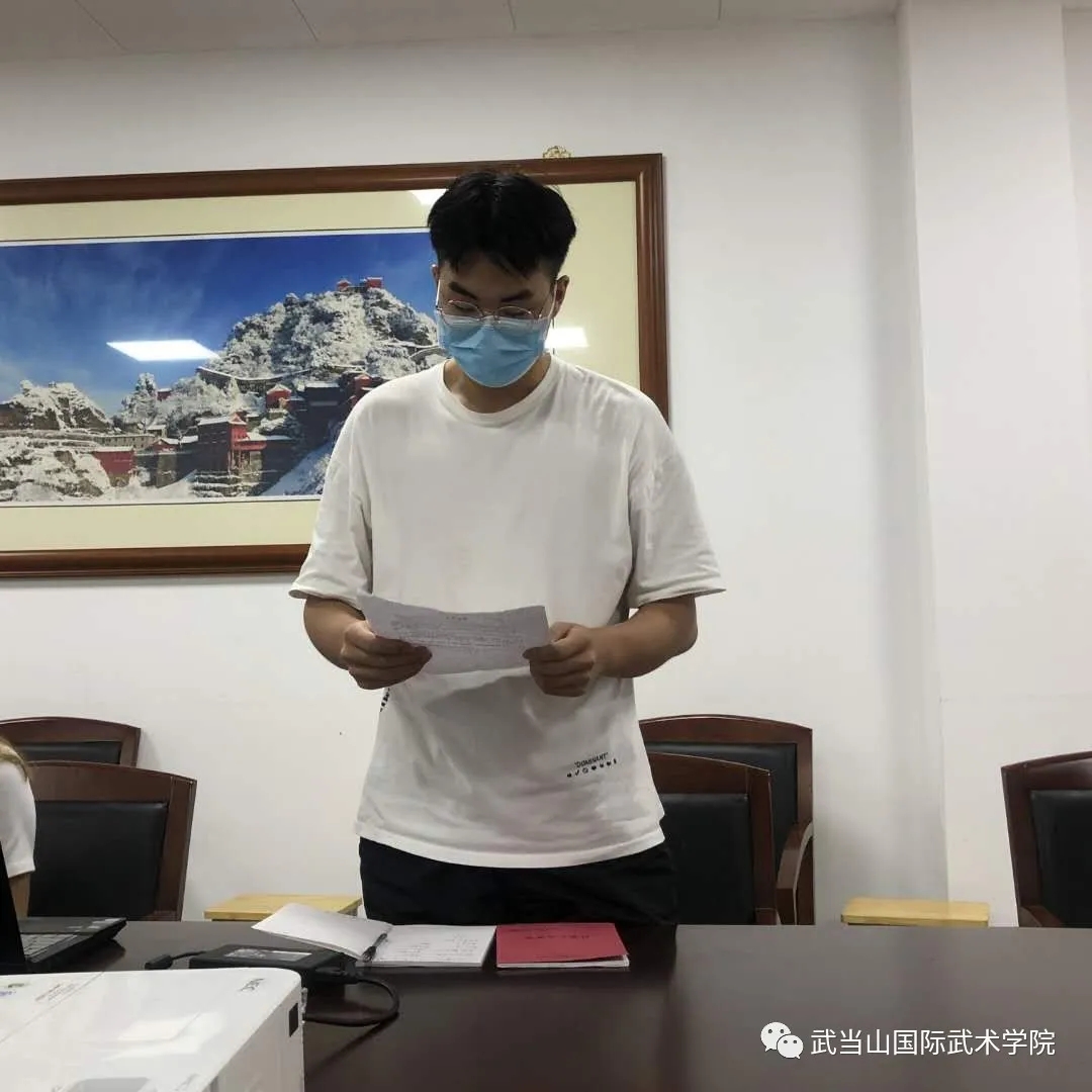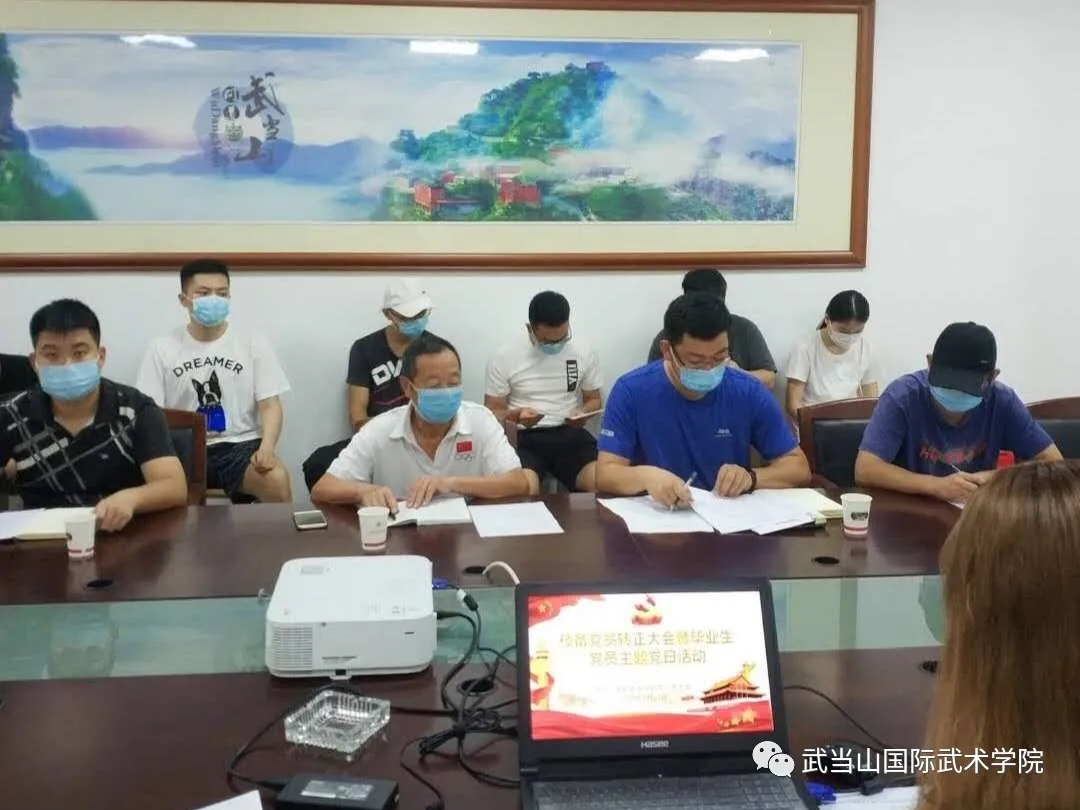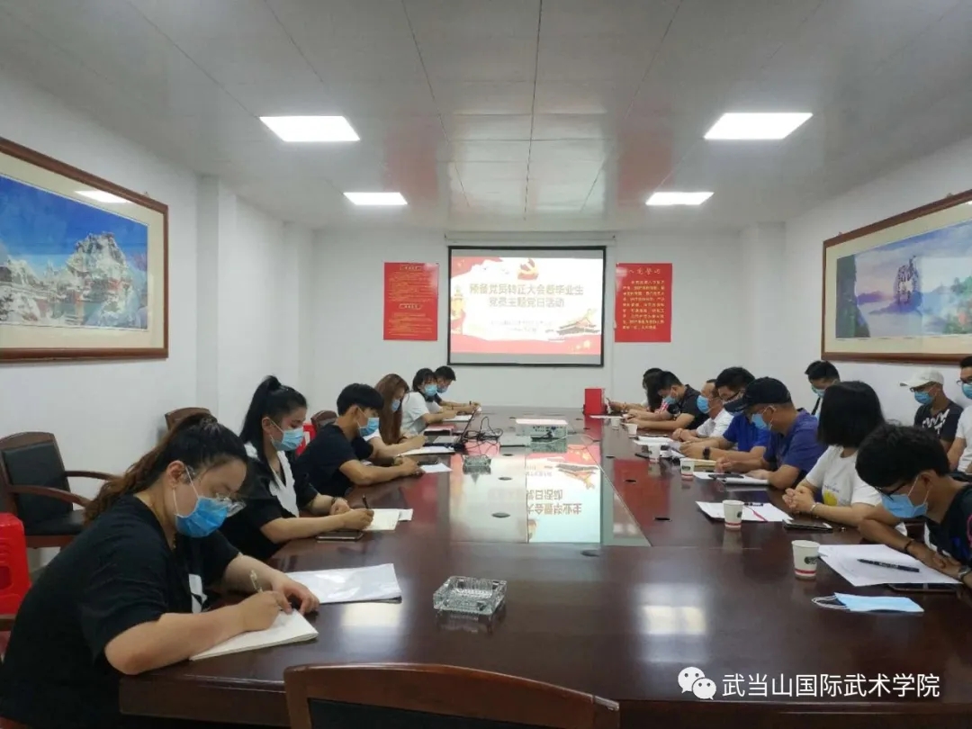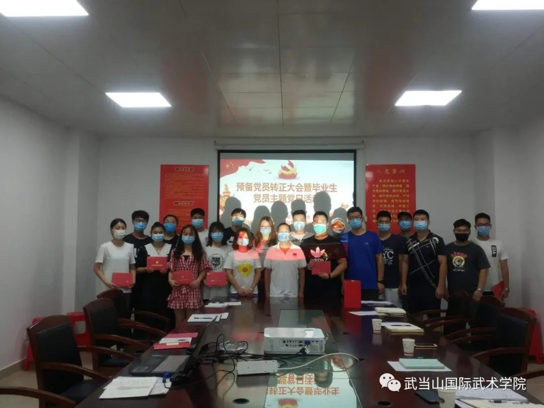 6月27日下午五点,武当山国际武术学院2016级学生党支部在行政楼209召开预备党员转正大会暨毕业生党员主题党日活动。院党总支副书记王根法、教师党员、学生党员共21名同志出席会议,本次会议由金梁老师主持。