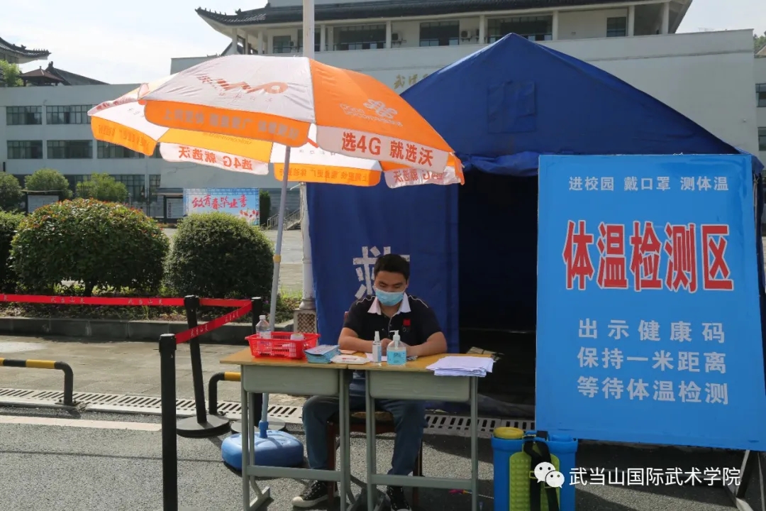 “毕业生专用通道”,学生报到时,经校门入校,校门口处搭建了防疫站,学生按要求间隔1米依次排开,经过检查核酸检测报告、检测体温等程序后,才能入校办理各项手续。
