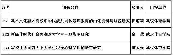 其中,田萌颖老师申报的《武术文化融入高校中华民族共同体意识教育的内化机制与路径研究》、金梁老师申报的《新媒体时代社会思潮对大学生三观影响研究》、谭大强老师申报的《家校社协同育人下大学生积极心理品质的培育研究》获专项任务研究项目立项。