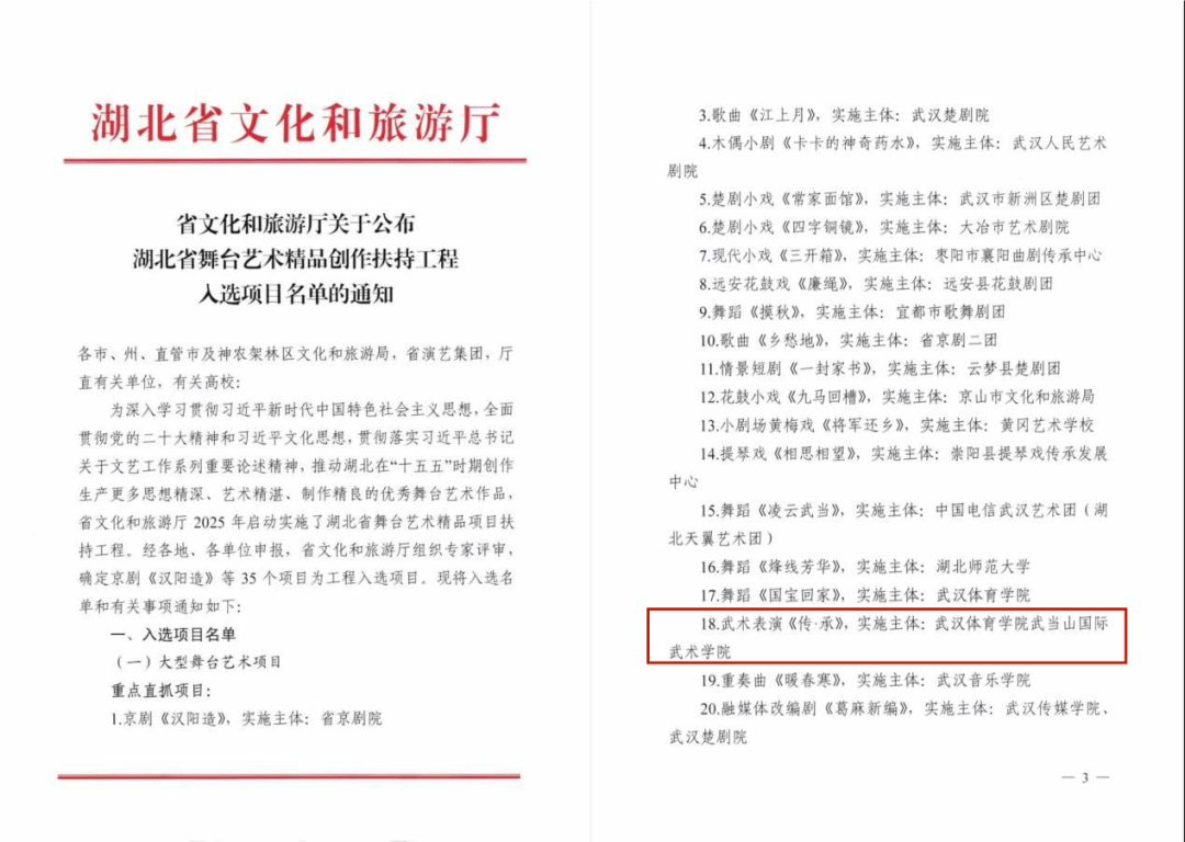 近日,湖北省文化和旅游厅公布了2025年湖北省舞台艺术精品创作扶持工程入选项目名单,我院原创武术表演剧目《传・承》成功入选,成为该工程中小型舞台艺术项目中的特色佳作,这是我院在武当武术文化艺术创作与传承领域取得的又一重要成果。