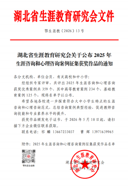 近日,湖北省生涯教育研究会公布了2025年生涯咨询与心理咨询案例征集获奖名单。我院教师提交的三篇案例入选,分别荣获一、二、三等奖,展现了我院在生涯教育及心理咨询领域的专业水平。