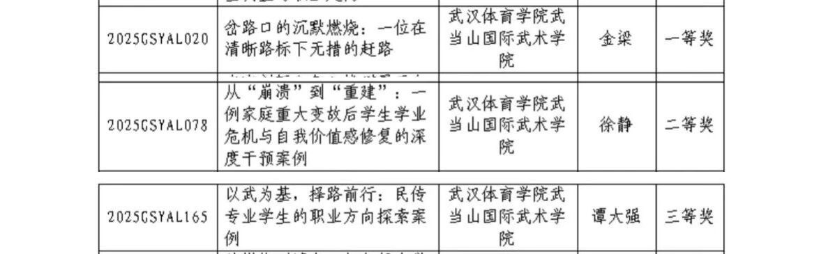 获奖案例包括:金梁老师《岔路口的沉默燃烧:一位在清晰路标下无措的赶路》(一等奖)、徐静老师《从“崩溃”到“重建”:一例家庭重大变故后学生学业危机与自我价值感修复的深度干预案例》(二等奖)、谭大强老师《以武为基,择路前行:民传专业学生的职业方向探索案例》(三等奖)。