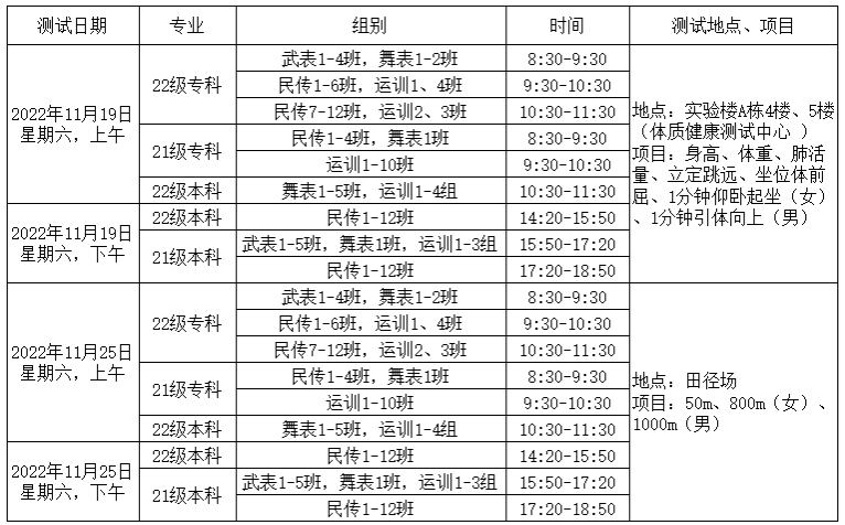 根据教育部《关于<国家学生体质健康标准>测试和上报工作的通知》和省教育厅办公室《关于切实做好<国家学生体质健康标准>测试和数据上报工作的通知》精神,为做好2022年度本科、专科学生《国家学生体质健康标准》测试及数据上报工作,我院决定对2021、2022级本科、专科学生开展《国家学生体质健康标准》测试及2019、2020级本科、专科学生补测工作。具体安排如下: