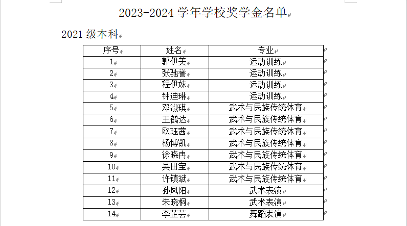根据武汉体育学院《关于开展我校2023—2024学年国家奖学金和学校奖学金评比工作的通知》文件精神、要求及评选办法,按规定程序,根据公开、公平、公正原则,经学生个人申请、年级评议、学院审核,评选出郭伊美等55名同学获得学校奖学金。(名单附后)现予以公示,公示时间:10月11日-10月15日。